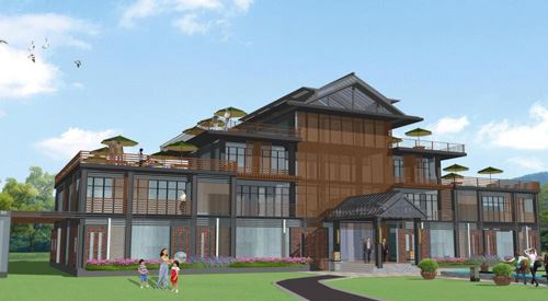 度假酒店周邊環(huán)境整體設(shè)計風格定位為簡約大氣。度假酒店前保留一定的草坪面積,使酒店一層窗口有比較開闊的視野和較好的采光。