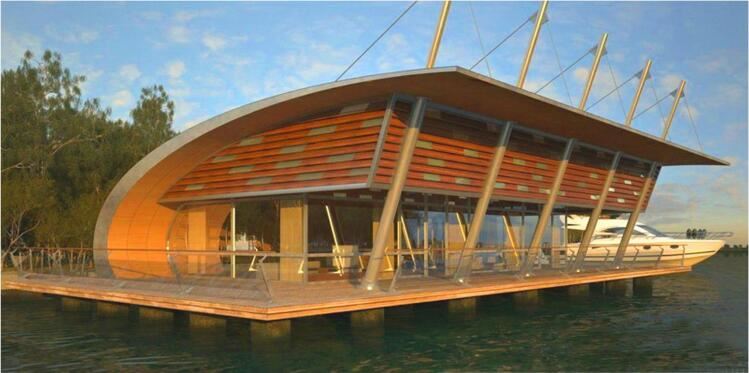 水上建筑設(shè)計適宜采用通透的建筑外殼,輕盈的建筑造型,因此該水上運動中心建筑設(shè)計采用現(xiàn)代風格,采用鋼架結(jié)構(gòu)的形式,建筑材料專用采用鋼構(gòu)架、防腐木和玻璃,屋頂設(shè)計采用流線型,挑出屋頂?shù)闹雍弯摻z拉線與現(xiàn)狀水上高爾夫的張拉膜結(jié)構(gòu)形成統(tǒng)一風格。